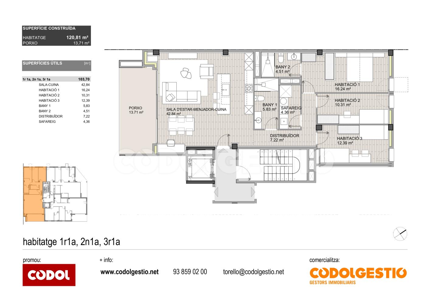 Habitatge de 120,81 m2 . El menjador sala d'estar té sortida directe a un espai exterior de 14,55m2 que dibuixa el cor del teu habitatge.L' espai de les tres habitacions ( una tipus suite) convida el benestar i els dos banys complets amb dutxa estan pensats amb un disseny inovador i d'elegància .Cambra de rentar pensat per viure amb practicitat. Molt assolellats i amb bona orientació.
