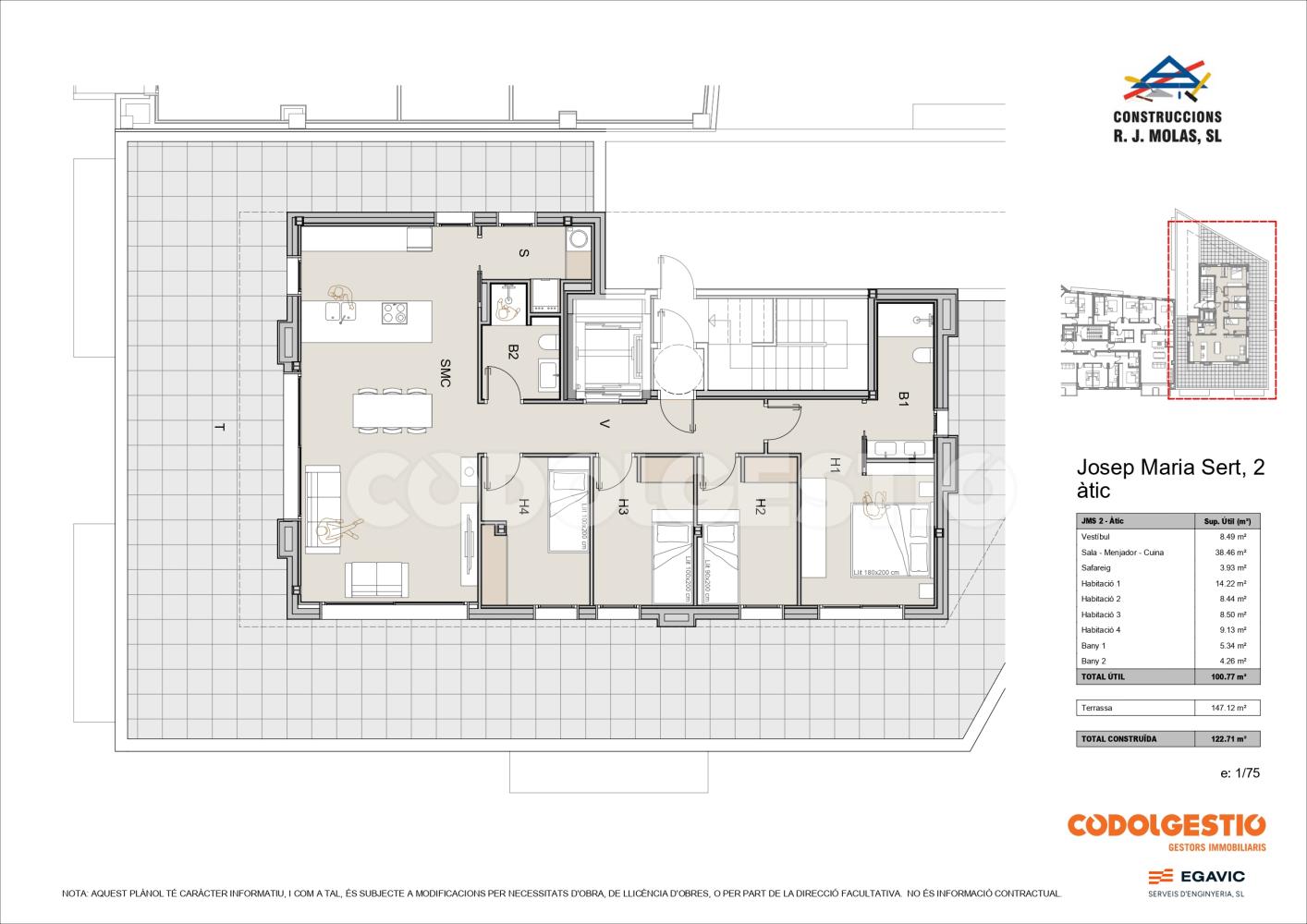 Benvingut a la teva nova llar. En una de les zones més tranquil·les i ben connectades de Vic, a pocs minuts del centre i envoltat de zones verdes, neix una promoció d’obra nova pensada per oferir-te confort, qualitat i eficiència energètica. Habitatges moderns, lluminosos i funcionals, dissenyats per adaptar-se al teu estil de vida. Pisos de 2, 3 i 4 habitacions, amb espais oberts, terrasses privades, zona de dia integrada i acabats de qualitat. Estances exteriors amb gran entrada de llum natural i distribucions optimitzades per aprofitar cada metre quadrat. Entre aquests habitatges destaca un àtic espectacular que combina amplitud interior amb un espai exterior excepcional. Es tracta d’un àtic amb una superfície construïda de 122,71 m², superfície útil de 101,21 m² i una impressionant terrassa de 147,30 m². Un habitatge que ofereix una gran privacitat, lluminositat i la possibilitat de gaudir de l’aire lliure amb vistes privilegiades sobre l’entorn. La promoció compta amb una façana d’obra vista amb sistema SATE (aïllament tèrmic exterior), que garanteix un alt nivell d’eficiència energètica i un gran confort interior durant tot l’any. El sistema de climatització per aerotèrmia, combinat amb terra radiant i fancoils, assegura una temperatura òptima amb un consum energètic molt reduït. A més, s’ofereix la possibilitat d’escollir alguns acabats interiors per personalitzar el teu habitatge al teu gust i fer-lo realment teu. El carrer Josep M. Sert es troba en un entorn residencial consolidat, amb fàcil accés a escoles, comerços, serveis sanitaris i transport públic. Un lloc perfecte per gaudir de la tranquil·litat sense renunciar a la proximitat del centre de Vic. També s’ofereixen places d’aparcament i trasters opcionals, per completar totes les comoditats que necessites. Aquesta promoció és molt més que un conjunt de pisos: és una oportunitat per estrenar llar amb espais pensats per viure millor, en un edifici construït amb criteris de sostenibilitat, eficiència i confort. Informa’t avui mateix i vine a conèixer el teu futur pis —o aquest exclusiu àtic— a Vic.