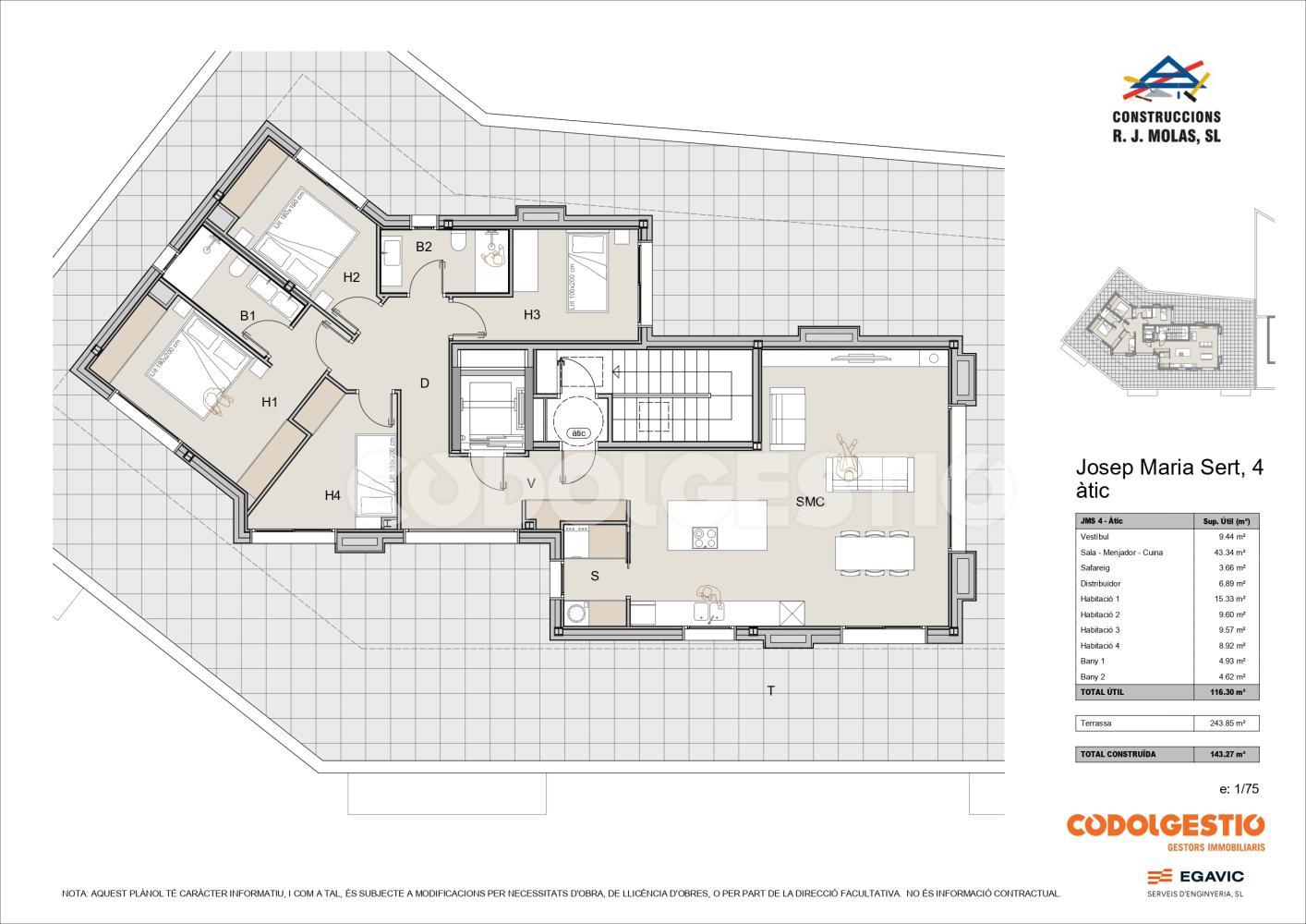 Benvingut a la teva nova llar. En una de les zones més tranquil·les i ben connectades de Vic, a pocs minuts del centre i envoltat de zones verdes, neix una promoció d’obra nova pensada per oferir-te confort, qualitat i eficiència energètica. Habitatges moderns, lluminosos i funcionals, dissenyats per adaptar-se al teu estil de vida. Pisos de 2, 3 i 4 habitacions, amb espais oberts, terrasses privades, zona de dia integrada i acabats de qualitat. Estances exteriors amb gran entrada de llum natural i distribucions optimitzades per aprofitar cada metre quadrat. Entre aquests habitatges destaca un àtic espectacular, únic dins la promoció, que combina amplitud interior amb un espai exterior excepcional. Es tracta d’un àtic amb una superfície construïda de 143,27 m², superfície útil de 116,19 m² i una impressionant terrassa de 248,39 m². Un habitatge que ofereix una gran privacitat, lluminositat i la possibilitat de gaudir de l’aire lliure amb vistes privilegiades sobre l’entorn. La promoció compta amb una façana d’obra vista amb sistema SATE (aïllament tèrmic exterior), que garanteix un alt nivell d’eficiència energètica i un gran confort interior durant tot l’any. El sistema de climatització per aerotèrmia, combinat amb terra radiant i fancoils, assegura una temperatura òptima amb un consum energètic molt reduït. A més, s’ofereix la possibilitat d’escollir alguns acabats interiors per personalitzar el teu habitatge al teu gust i fer-lo realment teu. El carrer Josep M. Sert es troba en un entorn residencial consolidat, amb fàcil accés a escoles, comerços, serveis sanitaris i transport públic. Un lloc perfecte per gaudir de la tranquil·litat sense renunciar a la proximitat del centre de Vic. També s’ofereixen places d’aparcament i trasters opcionals, per completar totes les comoditats que necessites. Aquesta promoció és molt més que un conjunt de pisos: és una oportunitat per estrenar llar amb espais pensats per viure millor, en un edifici construït amb criteris de sostenibilitat, eficiència i confort. Informa’t avui mateix i vine a conèixer el teu futur pis —o aquest exclusiu àtic— a Vic.